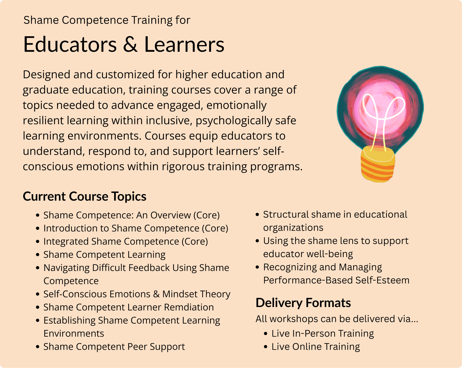 Applied Training Courses are most effective when paired with the Introduction to Shame Competence course, which provides an essential foundation for deeper learning and practice.
