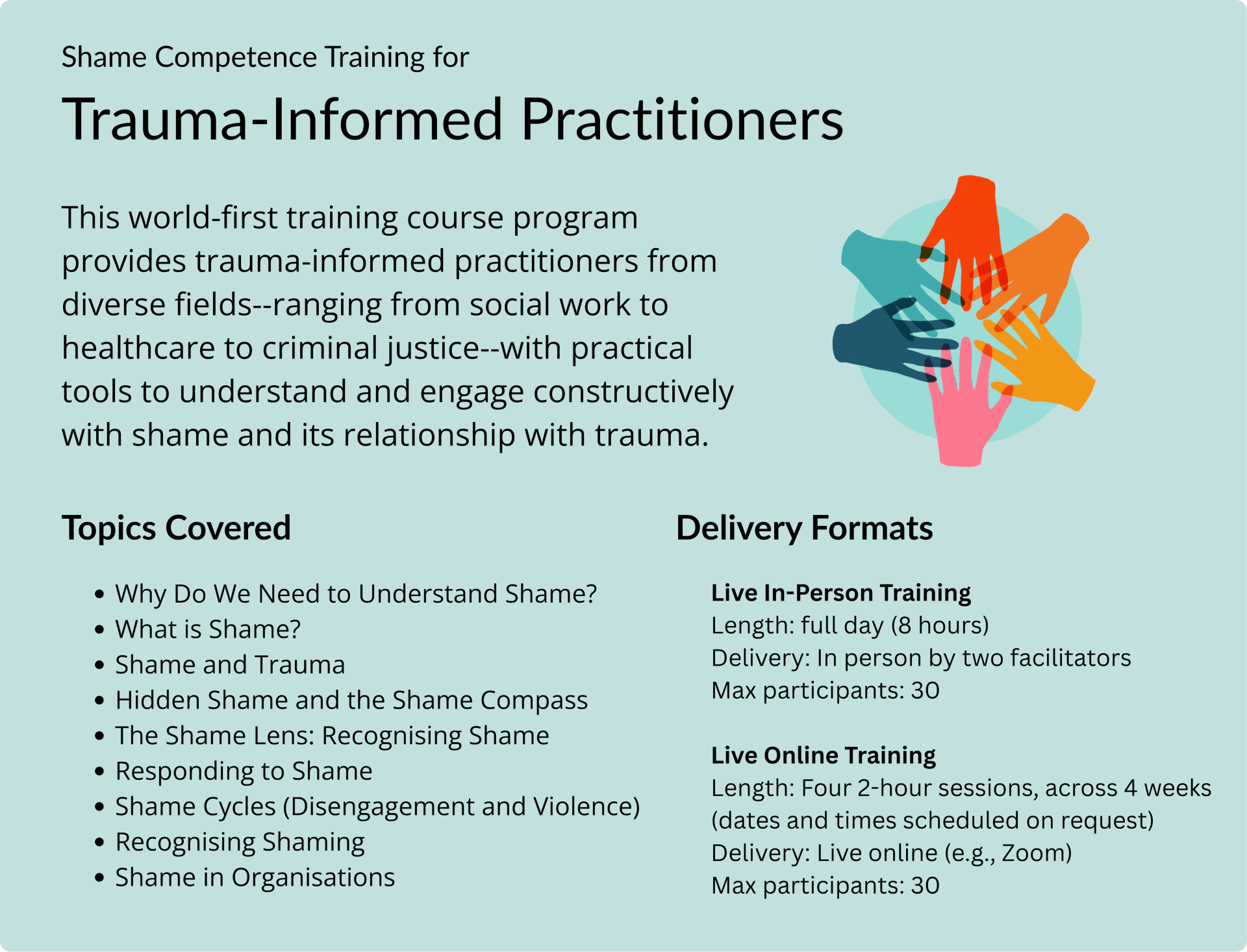 While trauma-informed approaches ask the important question ‘What happened to you?’ (instead of ‘What is wrong with you?’), the shame competent approach additionally asks, ‘What are you experiencing right now?’ This gives practitioners a practical understanding of how to best manage interactions and services to respond appropriately to individuals’ emotional and cognitive states in order to work towards positive outcomes and less disengagement.